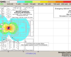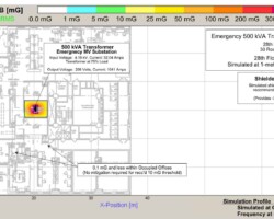 Power frequency magnetic field emissions of a new 500 kVA MV transformer room was modeled to verify the impact on human occupants and office staff during a normal work period (see Diagram #1 & #2,). To demonstrate the methodology of magnetic shielding effectiveness, we simulated unshielded vs. shielded emission profiles of the transformer room to show the reduction in magnetic field strength on nearby staff. To meet the human health and immunity threshold of 10mG RMS, the transformer room was shielded to provide -30dB of attenutation, see Diagram #3.