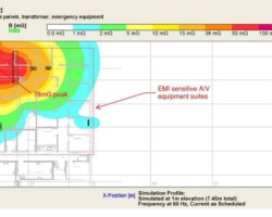 A 60 Hz simulation of the main and emergency electrical systems was performed to determine mitigation needs. A model was created to show emergency power as the broadcast facility must operate fully in case of emergency. It was determined that shielding was needed for the facility to meet the IE