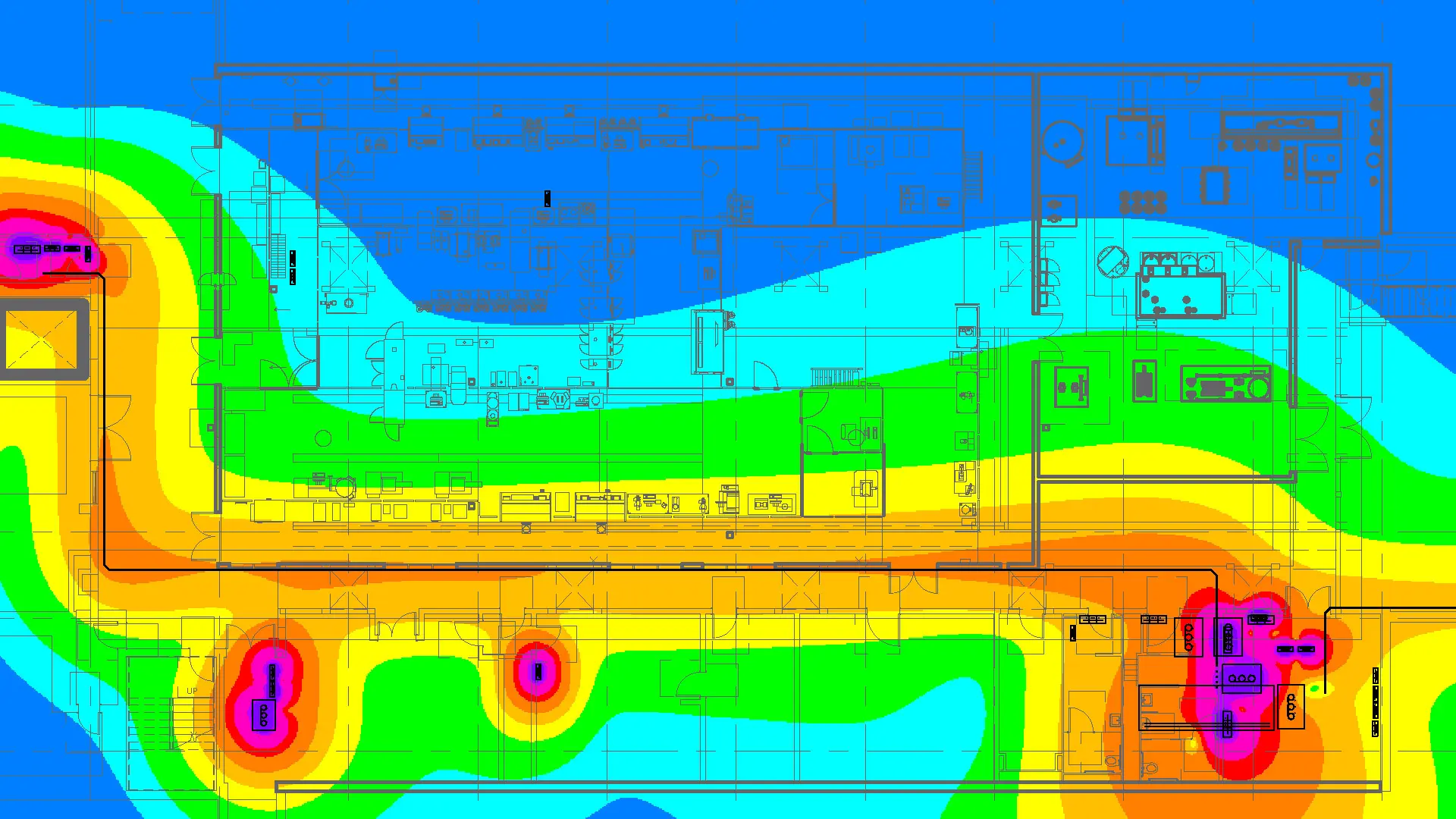 We provide plan-view and elevation view magnetic field simulation modeling of building electrical systems: Simulation modeling at a 50% and 75% building loads. These EMF simulation models illustrate the magnetic emissions profile as a 2D horizontal or vertical plane through the building. The sophisticated computer model calculates the magnetic emissions profiles as a function of magnitude and distance from the numerous electrical sources.